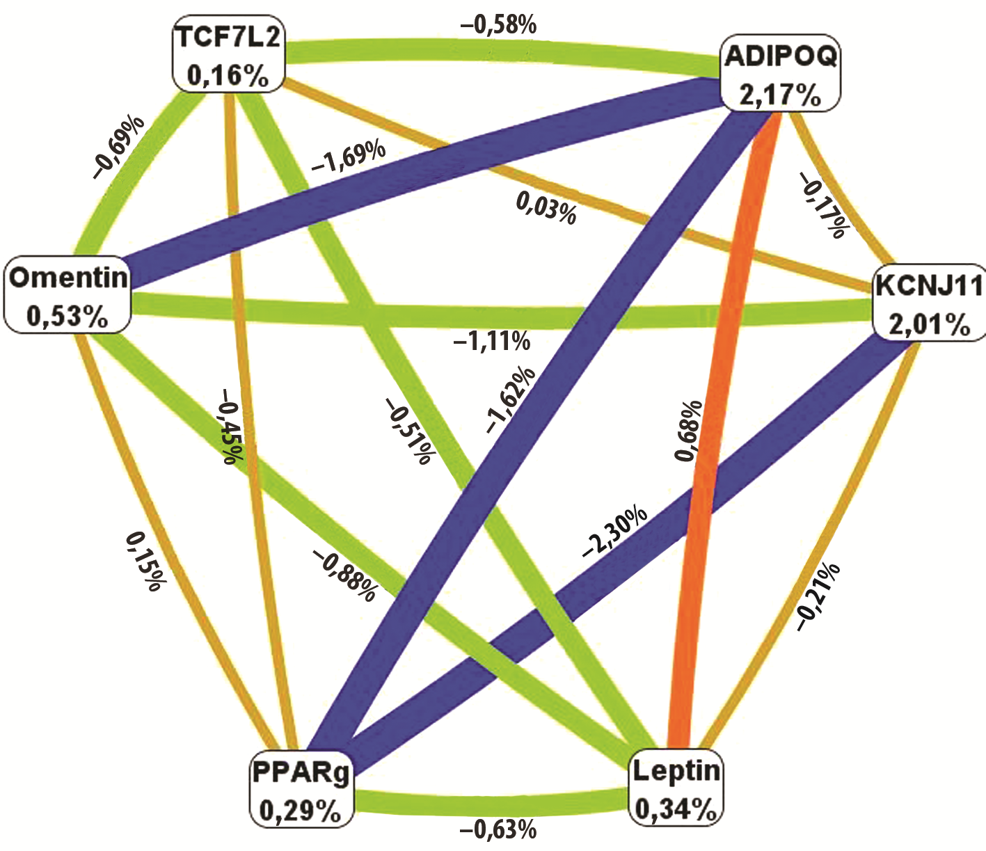 Рис. 7. Межгенные взаимодействия полиморфных локусов генов KCNJ11 (Glu23Lys), ADIPOQ (G276T), оментина (Val109Asp), лептина (G2548A), TCF7L2 (IVS3C/T) и гена PPARg (Pro12Ala) в формировании предрасположенности СД2 в Кыргызской популяции. Красный цвет обозначает высокую степень синергичного взаимодействия, оранжевый — меньшую степень взаимодействия; коричневый — промежуточный этап между совместными действиями и антагонизмом (отсутствие связи или независимость эффектов отдель- ных локусов); зеленый и синий — антагонизм эффектов с меньшей и большей степенью.