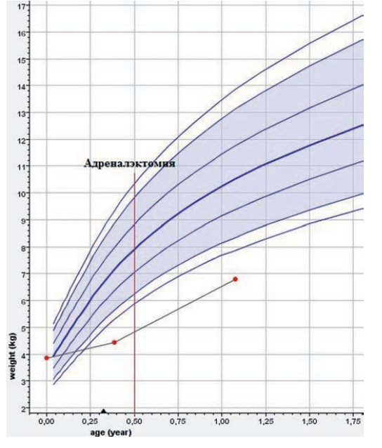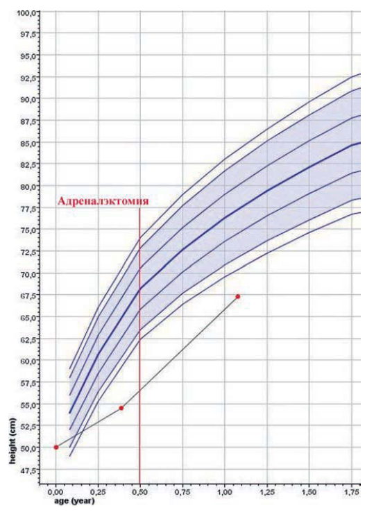 Пятна цвета «кофе с молоком» в сочетании с двусторонней гиперплазией надпочечников и МСКТ-признаками фиброзной дисплазии позволили установить диагноз: синдром МакКьюна—Олбрайта—Брайцева. От пробной терапии ингибиторами стероидогенеза решено было воздержаться в виду повышенного уровня трансаминаз и отсутствия уверенности в эффективности терапии. Учитывая двусторонний характер поражения надпочечников и большой риск рецидива в случае односторонней адреналэктомии, было выполнено двустороннее удаление надпочечников. Назначена заместительная терапия глюко- и минералокортикоидами. После оперативного лечения отмечалось улучшение состояния в виде нормализации клинических и биохимических показателей и ускорения темпов физического и психомоторного развития (рис. 1—4 см. на цв. вклейке). При осмотре в возрасте 1 года рост 63,7 см, SDS роста –3,62, вес 6,8 кг, SDS ИМТ –2,14. Ребенок начал ходить, произносить отдельные слова. При скрининге возможных компонентов заболевания, кроме признаков ФД (очаги разрежения костной ткани верхней трети бедренных костей), других проявлений СМОБ выявлено не было.