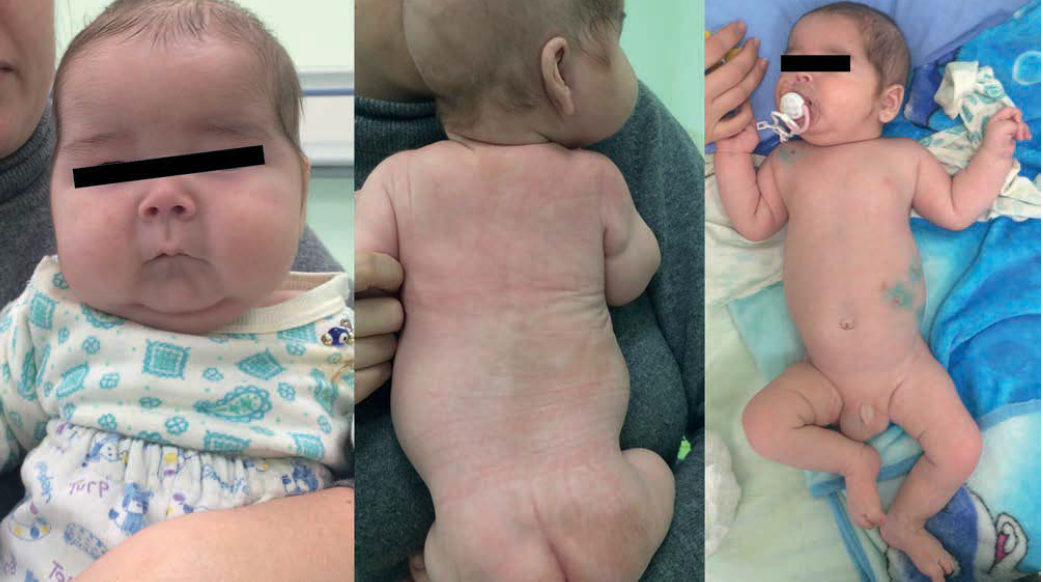 Ребенок рожден в неродственном браке от 2-й беременности 2-х родов в срок. При рождении показатели роста и веса соответствовали норме (рост 50 см, вес 3860 г). В возрасте одного месяца отметили появление пятен цвета «кофе с молоком», которых не было при рождении. На втором месяце жизни мальчик перенес правостороннюю верхнедолевую пневмонию. По данным медицинской документации, на тот момент отмечались повышенный уровень 17-ОН-прогестерона (34,4 нмоль/л) при уровне кортизола 550 нмоль/л и ЭХО-признаки двусторонней гиперплазии надпочечников. Однако ребенок был выписан после улучшения состояния без дополнительного обследования. Через две недели после выписки — повторная госпитализация в связи с фебрильной лихорадкой, явлениями энтероколита (многократный стул со слизью) и признаками инфекции мочевыводящих путей (микрогематурия, лейкоцитурия). Проведено несколько курсов антибиотикотерапии (цефепим, амикацин, ванкомицин, меронем, ампициллин), на фоне которой сохранялась субфебрильная лихорадка и воспалительные изменения показателей крови (нейтрофильный лейкоцитоз, повышение С-реактивного белка ++++, повышение прокальцитонина до 10 нг/мл при норме до 2 нг/мл). Во время нахождения в стационаре в течение 2,5 мес у ребенка неоднократно отмечались эпизоды тахикардии до 190 уд/мин, тахипное до 60/мин на фоне признаков дыхательной недостаточности (цианоз носогубного треугольника).