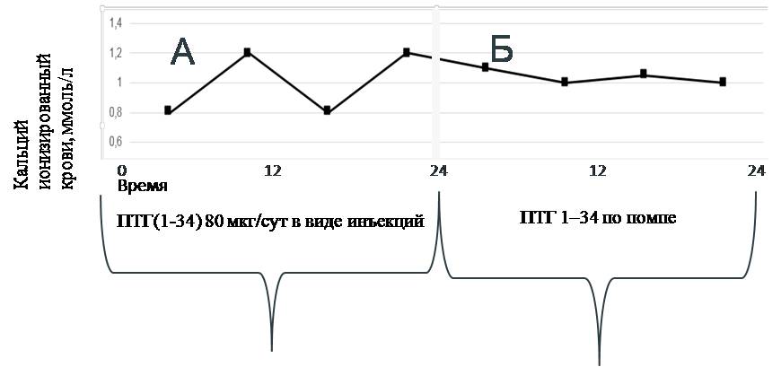 В возрасте 24 лет, в связи с невозможностью достижения нормокальциемии, часто повторяющимся судорожным синдромом (спастические судороги ног, рук и мимических мышц) на фоне очень высокой дозы альфакальцидола (20 мкг/сут), потребностью в частых внутривенных инфузиях препаратов кальция, было принято решение о пробном назначении генно-инженерного паратгормона (терипаратида). На фоне введения терипаратида в стартовой дозе 20 мг/сут отмечалось повышение уровня кальция в первые несколько дней после начала терапии. На 18-й день у пациентки возникли сильные боли в костях, купируемые нестероидными противовоспалительными препаратами, но через 3 дня эти боли самостоятельно исчезли и не возобновлялись на протяжении всего периода наблюдения. Нормализация уровня кальция была достигнута при двукратном введении терипаратида в сутки (суммарная доза 40 мкг/сут). В дальнейшем для поддержания нормального уровня кальция в крови пациентке потребовалось три инъекции терипаратида (60—80 мкг/сут). Тем не менее отмечались гипокальциемии в ранние утренние часы, что было связано с кратковременностью эффекта препарата. Доза терипаратида подбиралась эмпирически под контролем уровня ионизированного кальция в течение суток. В связи с этим было решено постоянно вводить препарат подкожно при помощи инсулиновой помпы. При этом удалось добиться постоянной нормокальциемии в течение суток (рис. 1, 2). Препараты альфакальцидолы были постепенно полностью отменены, и это не повлияло на уровень кальция. Эпизоды гипокальциемий в течение последних 2 лет были связаны исключительно с уменьшением доз терипаратида (в связи с отсутствием препарата). На фоне нормокальциемии уровень кальциурии соответствовал норме [4,08—5,8 ммоль/сут (2,8—8 ммоль/сут)].