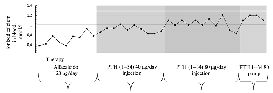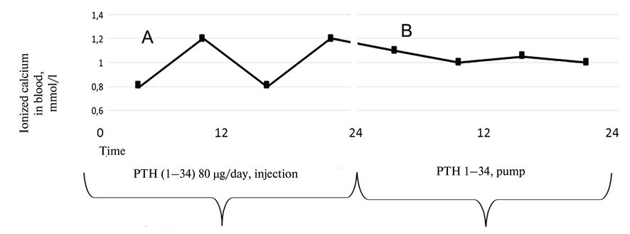 В возрасте 24 лет, в связи с невозможностью достижения нормокальциемии, часто повторяющимся судорожным синдромом (спастические судороги ног, рук и мимических мышц) на фоне очень высокой дозы альфакальцидола (20 мкг/сут), потребностью в частых внутривенных инфузиях препаратов кальция, было принято решение о пробном назначении генно-инженерного паратгормона (терипаратида). На фоне введения терипаратида в стартовой дозе 20 мг/сут отмечалось повышение уровня кальция в первые несколько дней после начала терапии. На 18-й день у пациентки возникли сильные боли в костях, купируемые нестероидными противовоспалительными препаратами, но через 3 дня эти боли самостоятельно исчезли и не возобновлялись на протяжении всего периода наблюдения. Нормализация уровня кальция была достигнута при двукратном введении терипаратида в сутки (суммарная доза 40 мкг/сут). В дальнейшем для поддержания нормального уровня кальция в крови пациентке потребовалось три инъекции терипаратида (60—80 мкг/сут). Тем не менее отмечались гипокальциемии в ранние утренние часы, что было связано с кратковременностью эффекта препарата. Доза терипаратида подбиралась эмпирически под контролем уровня ионизированного кальция в течение суток. В связи с этим было решено постоянно вводить препарат подкожно при помощи инсулиновой помпы. При этом удалось добиться постоянной нормокальциемии в течение суток (рис. 1, 2). Препараты альфакальцидолы были постепенно полностью отменены, и это не повлияло на уровень кальция. Эпизоды гипокальциемий в течение последних 2 лет были связаны исключительно с уменьшением доз терипаратида (в связи с отсутствием препарата). На фоне нормокальциемии уровень кальциурии соответствовал норме [4,08—5,8 ммоль/сут (2,8—8 ммоль/сут)].