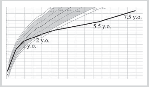 3. Рис. 3. Пациент 1 через год после начала лечения гормоном роста (8 лет). | |