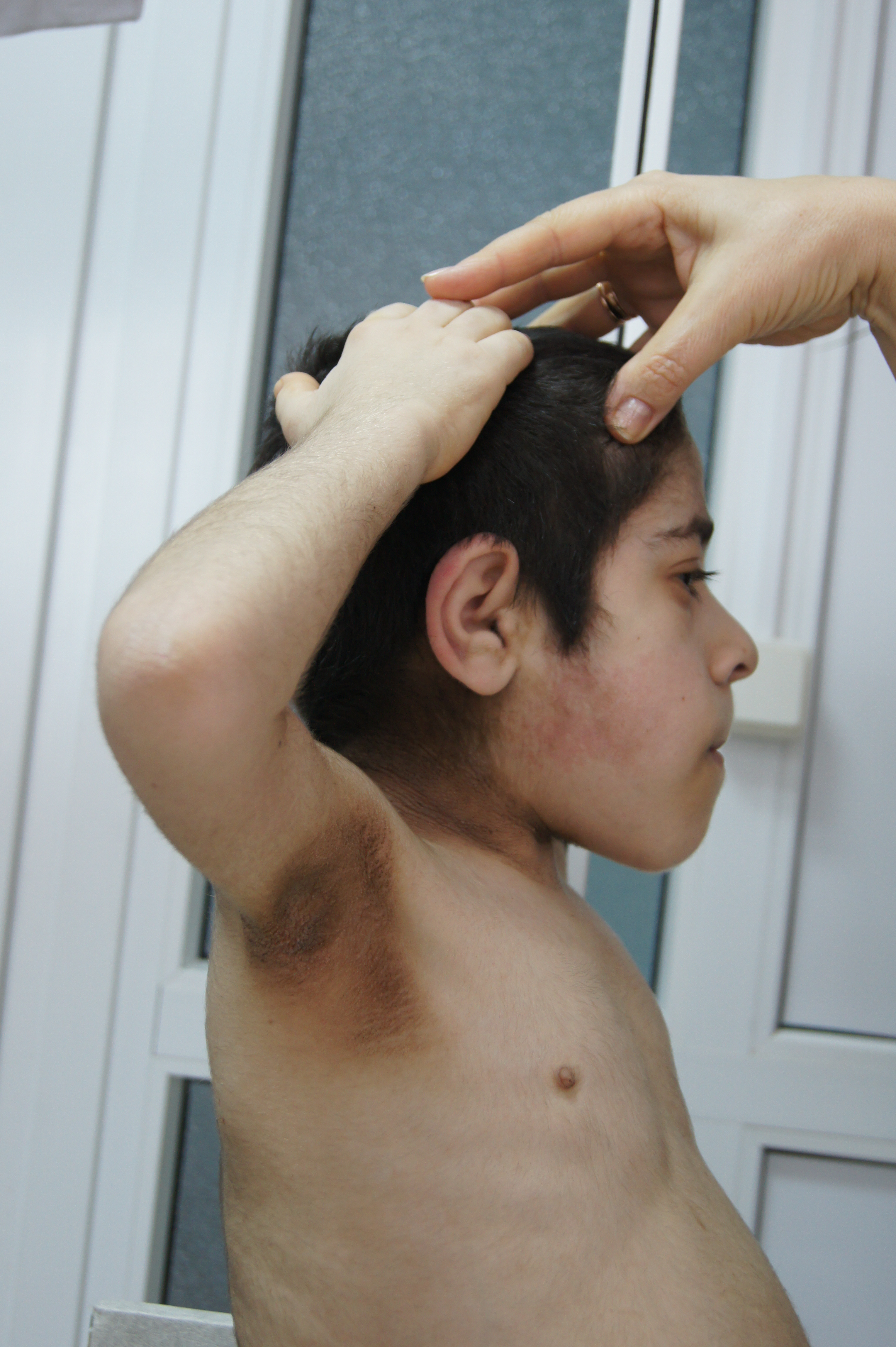 Объективный статус на момент осмотра: общее состояние тяжелое, обусловлено основным заболеванием. Длина тела 104 см (–10,3 SDS), масса тела 22 кг (3,33 SDS), рост ИМТ 20,4 кг/м2 (–0,36 SDS). Телосложение диспропорциональное за счет увеличенного в размерах живота, короткой шеи, сгибательных контрактур локтевых суставов, относительно крупных ладоней и стоп. На передней брюшной стенке ожоги в стадии регенерации (рис. 1 на цв. вклейке). Избыточная кожа в области ладоней и стоп. Гипертрихоз спины, конечностей. Волосы на голове черные, жесткие. Распространенные участки негроидного акантоза в области шеи, подмышечных впадин, локтевых сгибов, в околопупочной области, паховых складках (рис. 2 на цв. вклейке). Подкожно-жировой слой равномерно истончен. Мышечная система развита слабо, особенно на конечностях.