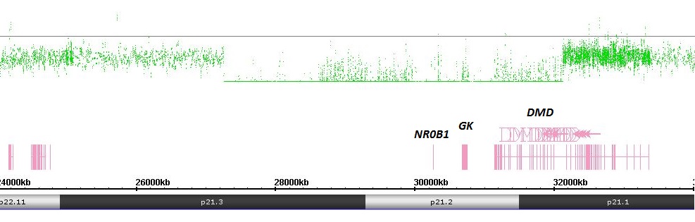 Было получено добровольное согласие родителей пациента на генетическое исследование. В результате хромосомного микроматричного анализа (микроматрица Cytoscan HD, Affymetrix, США) выявлена гемизиготная делеция участка короткого плеча X-хромосомы c позиции 27242551 до позиции 32110378, захватывающая регионы Xp21.1—p21.3, размер делеции составил 4 867 827 п.н. Молекулярный кариотип (согласно ISCN 2016): arr[hg19] Xp21.3p21.1(27242551_32110378)x0. В районе дисбаланса расположены гены: MAGEB10, IL1RAPL1, MAGEB2, MAGEB3, MAGEB4, MAGEB1, NR0B1, GK, TAB3, FTHL17, DMD (см. рисунок).