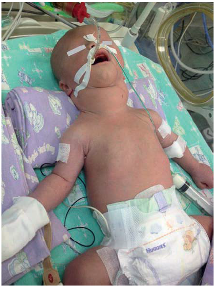 Доношенный мальчик родился от здоровых молодых родителей, в семье случаев заболеваний щитовидной железы отмечено не было, брак не близкородственный. В гормональном профиле матери — эутиреоз. На сроке беременности 33 нед, по данным УЗИ у плода было выявлено объемное образование шеи больших размеров, в связи с чем было принято решение о плановом оперативном родоразрешении. На сроке гестации 39 нед было произведено кесарево сечение, в результате которого был извлечен живой мальчик с массой тела 3722 г и длиной 53 см. Ребенок родился с признаками асфиксии (оценка по шкале Апгар 4/6/7 баллов) в результате компрессии трахеи объемным образованием шеи, что требовало экстренной интубации и проведения ИВЛ. Однако большой размер образования и компрессия трахеи привели к сложности интубации. На 1-й минуте она была безуспешна, в результате ИВЛ осуществлялась с помощью ларингеальной маски. Интубацию удалось выполнить со 2-й попытки на 4-й минуте с последующим проведением ИВЛ (рис. 1, см. на цв. вклейке).