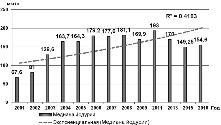 В течение всего периода наблюдения в выборочных ограниченных группах населения проводятся исследования по комплексной оценке экскреции йода с мочой; доли обследованных, потребляющих йодированную соль, а также доли пациентов с увеличением размеров щитовидной железы. Все определения экскреции йода с мочой проводились спектрофотометрическим церий-арсенитным методом, принятым ВОЗ в качестве стандартного международного метода в лаборатории, включенной в систему внешнего контроля качества для стран ЦВЕ/СНГ и успешно аттестованной [3]. При выборе группы исследования учитывается наличие исходных данных ВОЗ (1999) [4, 5]. Начиная с 2001 г. полученные результаты свидетельствовали об отсутствии йодного дефицита; медиана йодурии во всех проведенных исследованиях превышала 100 мкг/л. Динамика данных по оценке экскреции йода с мочой (по результатам выборочных исследований) в Беларуси с 2001 по 2016 г. представлена на рис. 1. Приведенные результаты включают данные как общенациональных исследований, так и исследований малых групп детей и беременных женщин. В последнем исследовании 2016 г. медиана йодурии важнейшей группы риска — беременных женщин составила 149,1 мкг/л [6, 7].