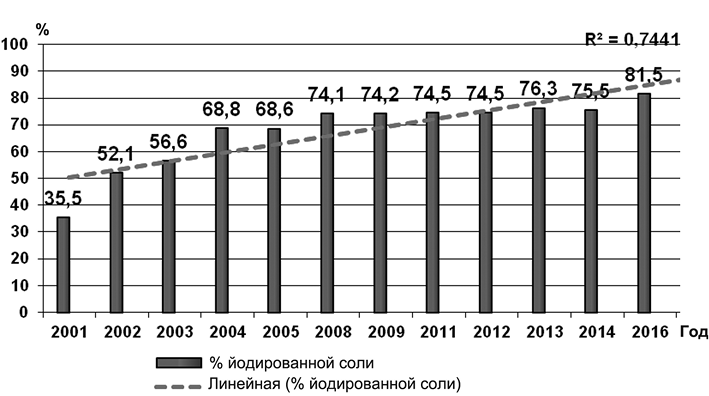 Рис. 2. Доля продаж йодированной соли в Республике Беларусь в 2001—2016 гг.
