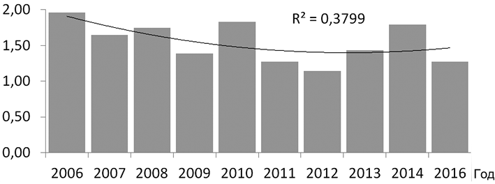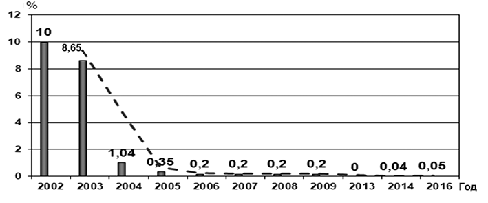 Рис. 3. Динамика доли образцов йодированной соли, не соотвествующих стандартам качества (2002—2016 гг.). Количество проб из всех областей — более 2000 в год.