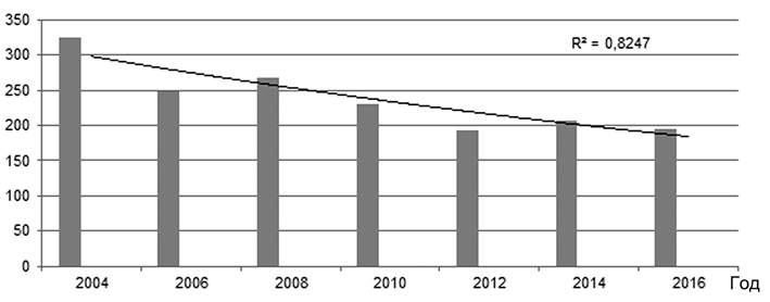 Одним из наиболее достоверно оцениваемых показателей является частота простого нетоксического зоба в общей популяции и у детей до 18 лет. Первичная заболеваемость простым нетоксическим зобом снизилась с 325,0 на 100 000 населения в 2000 г. до 59,9 на 100 000 населения в 2016 г. (рис. 4). Менее значимые результаты снижения первичной заболеваемости были зарегистрированы у детей до 18 лет: в этой категории заболеваемость снизилась до 194,54 на 100 000 (рис. 5) [12—16].