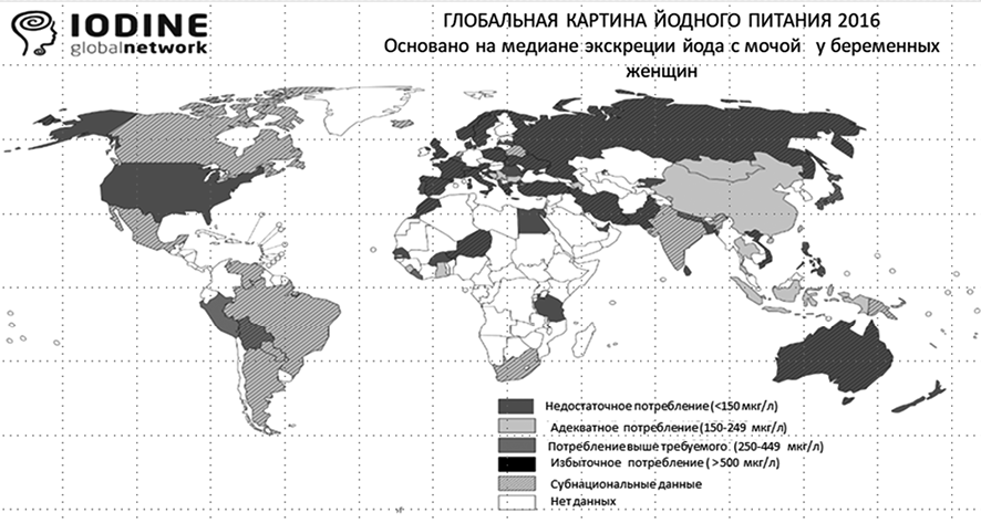 8. Рис. 8. Данные IGN 2016 г.: медиана экскреции йода с мочой у беременных женщин [20]. | |