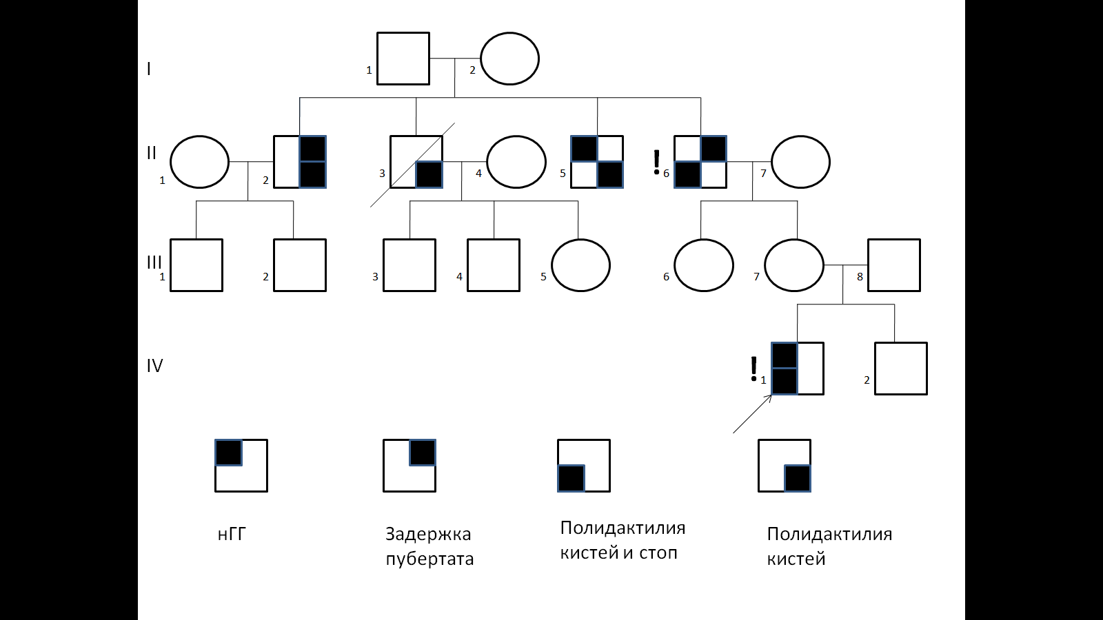 Родители пробанда и известные родственники второй линии практически здоровы, однако у деда и его родных братьев (двоюродные деды для нашего пациента) по материнской линии в анамнезе поздний пубертат, двусторонняя полидактилия кистей и/или стоп. Дед в 17 лет был обследован по поводу низкого роста и отсутствия пубертата, в течение 1 года получал заместительную гормональную терапию без эффекта, в 20 лет имели место самостоятельный ростовой скачок и начало полового созревания. О родных братьях деда также известно, что у них был поздний пубертат (18—20 лет).