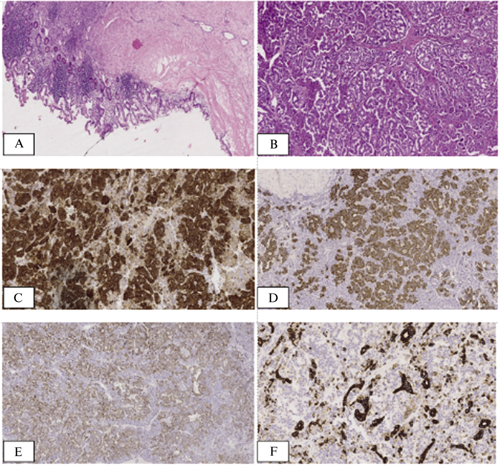 Макроскопически образование средостения многодольчатого строения, размером 13,5×7,5×3,7 см, в капсуле бурого цвета, на разрезе серо-желтого цвета с множеством кист. При микроскопическом исследовании: ткань тимуса с кистозной полостью, выстланной плоским эпителием, в стенке кисты разрастания сосочкового строения и розеткоподобных комплексов, первоначально расцененных как нейроэндокринная опухоль. Проведено ИГХ-исследование: в ткани поджелудочной железы, входящей в состав тератомы, экспрессируются синаптофизин, хромогранин А, СК18, KI-67 — 8%, реакция с СДХ2 негативная. Установлен диагноз злокачественной нейроэндокринной опухоли, рекомендовано наблюдение онколога.