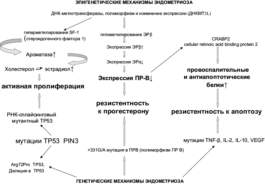 Продукты вышеперечисленных генов регулируют ключевые процессы пролиферации и апоптоза в нормальном эндометрии, и мутации в этих генах неизбежно ведут к нарушению гомеостаза эндометрия, приводящему к активации одного или нескольких патогенетических звеньев эндометриоза. Основные из них: