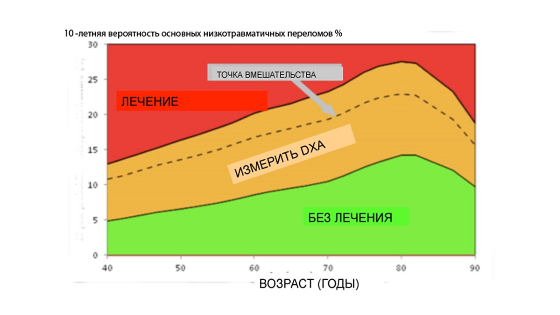 2. Рисунок 2. Точка вмешательства FRAX®, предложенная для Российской популяции по данным исследований в Ярославле и Первоуральске (ИМТ 24 кг/м2), без данных по МПК | |