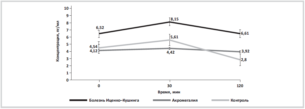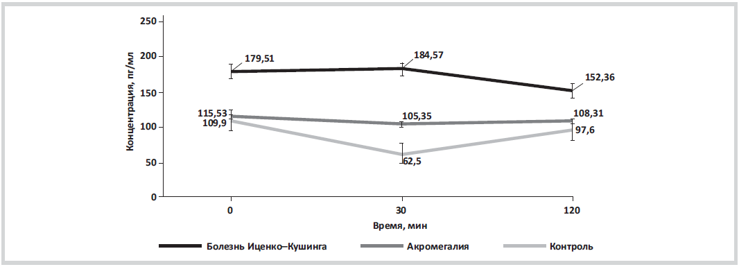 Material and methods. The study included 42 patients with Cushing’s disease and acromegaly; the mean patient age was 37.5 years. All patients were newly diagnosed with Cushing’s disease and acromegaly: none of them had a history of previous drug therapy, radiotherapy, or pituitary surgery. All patients underwent the oral glucose tolerance test with measurements of glucose, glucagon, and GLP-2 levels at 0, 30, and 120 min, respectively.