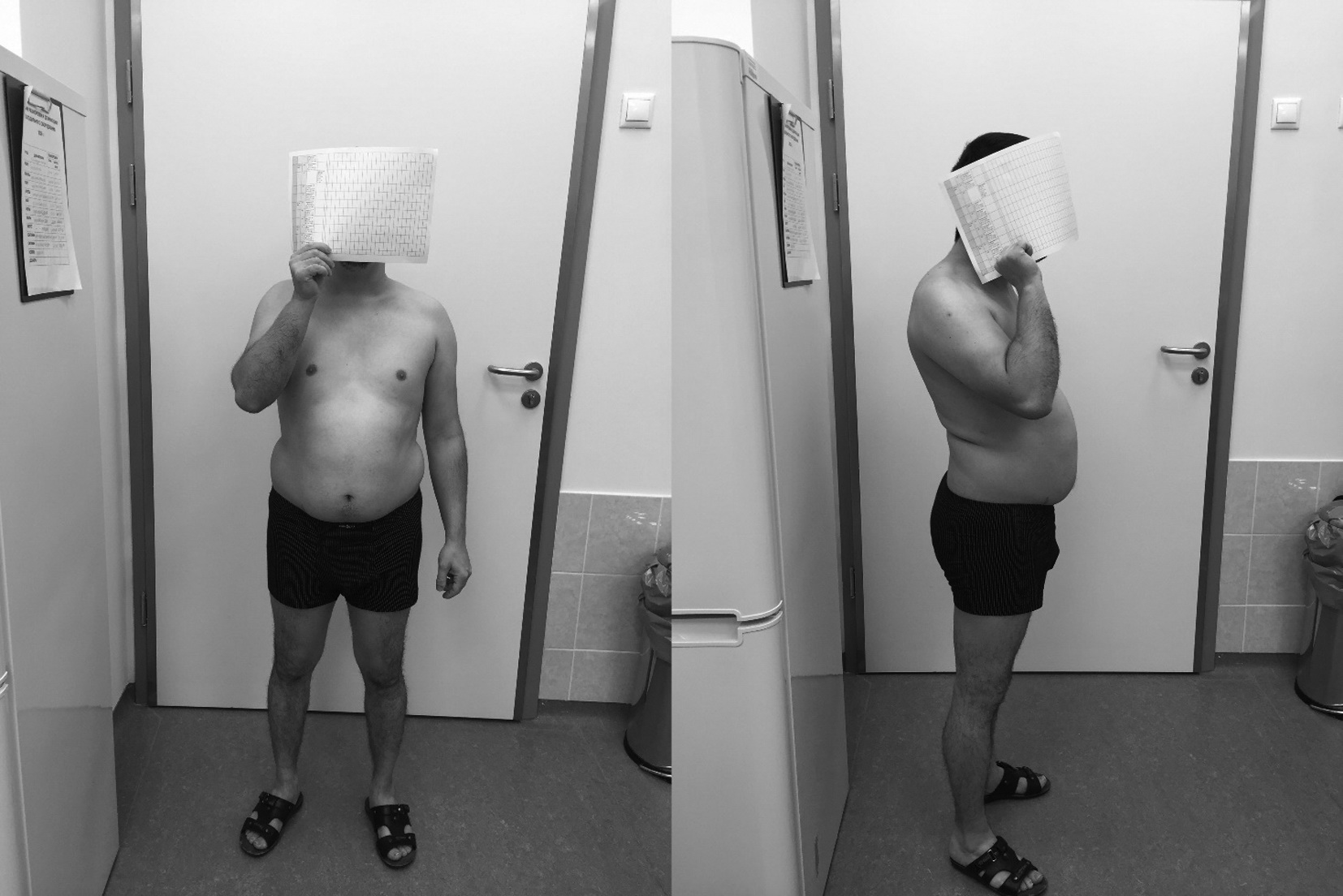 При осмотре на момент первого обращения (рис. 1): рост 160 см, масса тела 73 кг, ИМТ 28,9 кг/м2, кожа умеренно смуглая с землистым оттенком и умеренной гиперпигментацией ореол и локтей, подкожная жировая клетчатка развита избыточно, распределена по абдоминальному типу, тургор снижен, АД 80/55 мм рт.ст., оволосение по мужскому типу, скудное, яички в мошонке, дряблые, объем 4 мл. Уровень ТТГ, тиреоидных гормонов, пролактина в норме. Малая проба с дексаметазоном отрицательная (кортизол 341 нмоль/л).