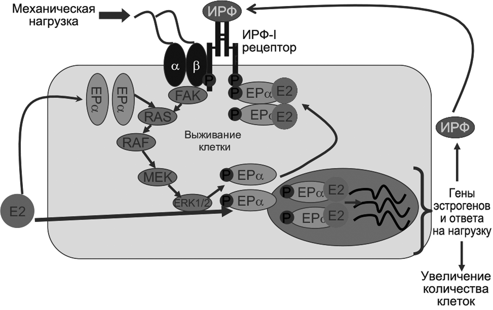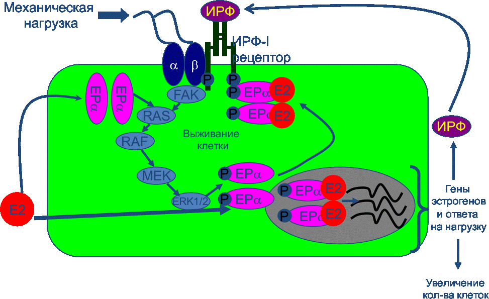 α, β — субъединицы белков-интегринов; ЕРα — α-субъединица эстрогеновых рецепторов; FAK, Ras, Raf, MEK, ERK1/2 — элементы сигнального пути MAPK/ERK; Е2 — эстрадиол; P — фосфатный остаток. Интегрины совместно с рецепторами к ИФР-1 запускают каскад внутриклеточных реакций, включая активацию сигнального пути MAPK/ERK (митогенактивируемая протеинкиназа/киназа, регулируемая внеклеточным сигналом) и затем эстрогеновых рецепторов. В присутствии эстрадиола механическая нагрузка вызывает фосфорилирование эстрогеновых рецепторов ERK-1 и ERK-2, приводящее как к классической активации транскрипции генов внутри ядра, так и к участию эстрогеновых рецепторов во внеклеточной передаче сигналов. Эстрадиол и механическая нагрузка регулируют экспрессию генов ИФР-1 и ИФР-2, воздействующих аутокринным или паракринным образом на рецепторы ИФР-1, которые в свою очередь требуют наличия эстрогеновых рецепторов для проведения сигнала. Таким образом, анаболический эффект СТГ в костной ткани при механической нагрузке реализуется через увеличение секреции ИФР-1 с активным вовлечением в процесс эстрогенов (в частности эстрадиола, и эстрогеновых рецепторов).