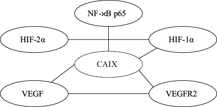 Известно, что ядерный фактор NF-κB может влиять на экспрессию ростового фактора VEGF как непосредственно, так и путем регуляции транскрипции ядерного фактора HIF-1α [16, 17]. Связь между экспрессией HIF-1α и HIF-2α, CAIX, VEGFR2 и между экспрессией HIF-2α и HIF-1α, VEGF также можно объяснить способностью HIF-1α и HIF-2α усиливать транскрипцию генов. Подобные сведения имеются в работах последних лет [18, 19]. Также показана совместная регуляция экспрессии VEGF, его рецептора и CAIX, что является свидетельством эффективной регуляции ангиогенеза.