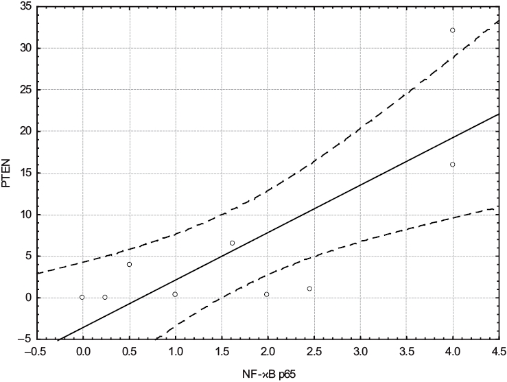 Рис. 2. График рассеяния между экспрессией PTEN и экспрессией NF-κB p65.