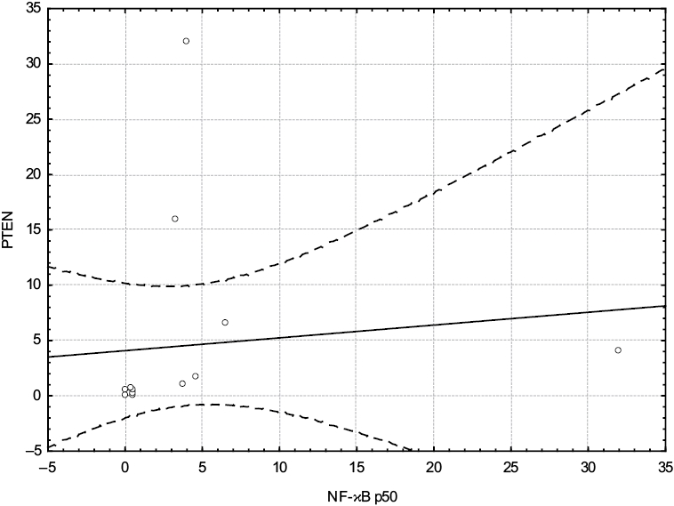 Рис. 3. График рассеяния между экспрессией PTEN и экспрессией NF-κB p50.