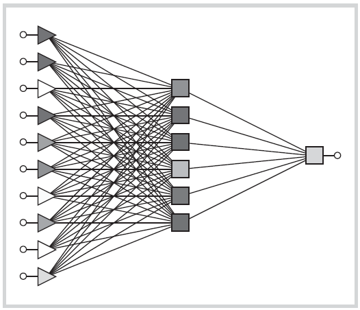 2. Рис. 1. Схематическое изображение 3-слойного персептрона — одной из наиболее популярных топологий искусственных нейронных сетей. Между входным слоем (из 10 нейронов — слева) и выходным слоем (из 1 искусственного нейрона — справа) расположен слой из 6 скрытых искусственных нейронов. | |