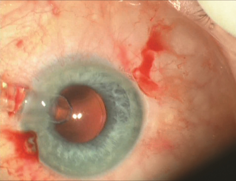 Из особенностей самой операции необходимо указать на проблемы, связанные с офтальмогипертензией и моделью имплантированной ИОЛ. Несмотря на гипотензивную глазную терапию (включающую «Диакарб» в 17.00 накануне операции и утром в день операции, 1% раствор «Бетоптика» 2 раза в день), во время операции радужка постоянно вставлялась в тоннельный 2,2 мм разрез. На выбор полужесткой модели ИОЛ повлияли подвывих хрусталика 1—2-й степени и возможность фиксации линзы в цилиарную борозду. Особенностью акриловой модели ИОЛ MА-60-AC является наличие жестких гаптических элементов, что вынуждает увеличивать тоннельный разрез до 3,5—4,0 мм для имплантации ИОЛ в свернутом виде. Повышенное ВГД затрудняет имплантацию линзы, выталкивая ее наружу (рис. 5, на цв. вклейке).