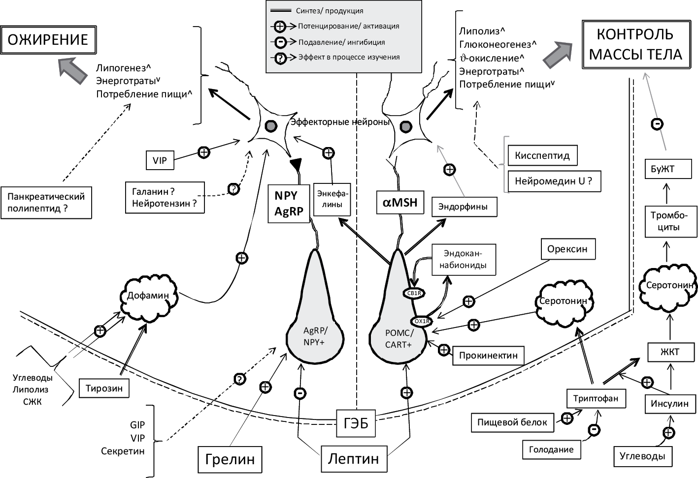 Накоплен большой объем данных о роли нейротрансмиттеров и нейропептидов в регуляции баланса энергии, формирования жировых запасов организма и пищевых поведенческих реакций. Гомеостаз этих функций в норме обусловлен конкуренцией альтернативных механизмов, локализованных преимущественно в ГТ. На уровне аминергической регуляции — это системы серотонина и дофамина, пептидергической — системы NPY/AgRP- и POMC/CART-родственных пептидов. Связь «метаболического» контура регуляции, реагирующего на дефицит и избыток энергосубстратов, с «гедонистическим» (связанным с получением удовольствия от потребления пищи) осуществляется при участии опиоидных и каннабиноидных рецепторов и их эндогенных лигандов, тесно взаимодействующих с указанными пептидергическими и аминергическими регуляторными подсистемами ЦНС. В основе механизмов реакции пептид­ергических и аминергических нейронов на стимулы (будь то нутриенты, либо гормоны, такие как лептин, грелин и пептиды ЖКТ) лежит взаимодействие лигандов со специфическими GPCR-рецепторами соответствующих нейронов. Нарушение указанных центральных механизмов рассматривается в качестве одного из главных патогенетических факторов Ож и одновременно причины неуспешности или нестойкости редуцирующей диетотерапии при этом состоянии.