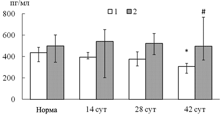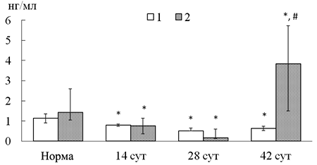 Material and methods. The work was performed on 17 adult female chinchilla rabbits. The first group of rabbits underwent a “false operation” (n=5); the second group (n=6) underwent ovariectomy. The third group (n=6) was ovariectomized and received estradiol (0.5 mg/rabbit) for 14 days (starting on the 14th postoperative day), followed by combined administration of estradiol (0.5 mg/rabbit) and progesterone (5 mg/rabbit) for 14 days. The Pgp functional activity was determined in rabbits of all groups using HPLC analysis of fexofenadine pharmacokinetics on day 7 before the study onset and on day 14, 28, and 42 after the operation. Accumulation of fexofenadine in rabbits indicates Pgp inhibition, and a decrease in its content means Pgp induction.