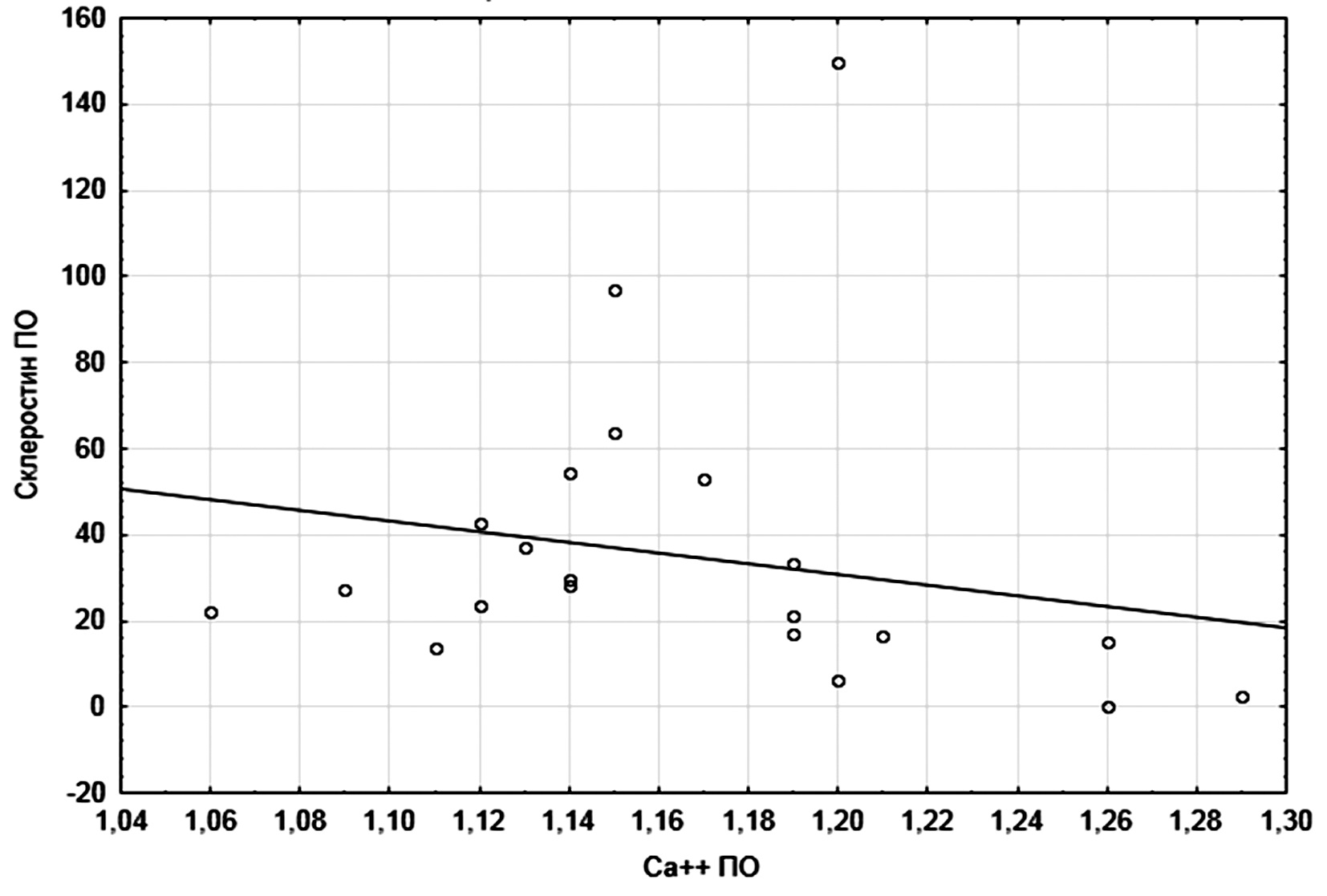 3. Fig. 3. Correlation of the concentration of sclerostin and ionized calcium in the 2nd group (r = –0.45; p = 0.037).