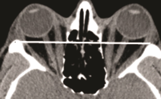 Рис. 4. Липогенный вариант эндокринной офтальмопатии. б — МСКТ орбит, аксиальная проекция (глазные яблоки расположены выше межскуловой линии – белая линия).