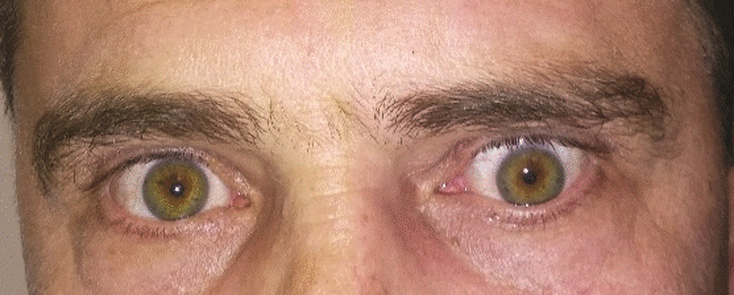 Тиреотоксикоз сам по себе может приводить к нарушению двигательной функции мышц глаза, гладких мышц зрачка вследствие воздействия избытка тиреоидных гормонов на двигательные центры и/или проводящие пути центрального и периферического отделов нервной системы. Первоначально тиреотоксикоз вызывает гипертонус мышцы Мюллера, верхней прямой мышцы и леватора верхнего века [7]. В результате развивается ретракция верхнего века (рис. 2 на цв. вклейке, см. раздел Дополнительная информация). При этом возникает картина ложного экзофтальма. Именно с ретракцией верхнего века связано появление симптомов Грефе (отставание верхнего века от верхнего лимба), Дальримпля (расширение глазной щели с появлением белой полоски между верхним лимбом и краем верхнего века) и Штельвага (редкое мигание век в сочетании с расширением глазной щели).