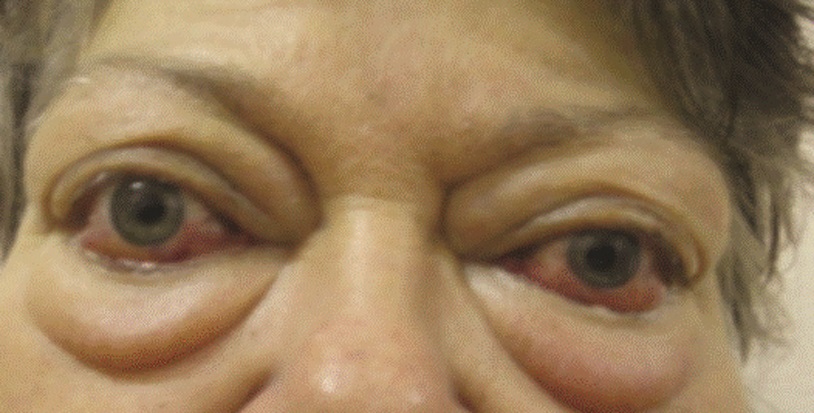 Следующим ранним проявлением ЭОП являются периорбитальные отеки. Отек век приводит к формированию мешков над и под глазами. На стадии выраженной клинической симптоматики отек век сопровождается гиперемией кожи или даже некоторой синюшностью (из-за венозного стаза).