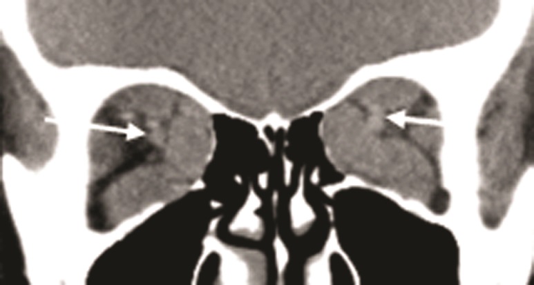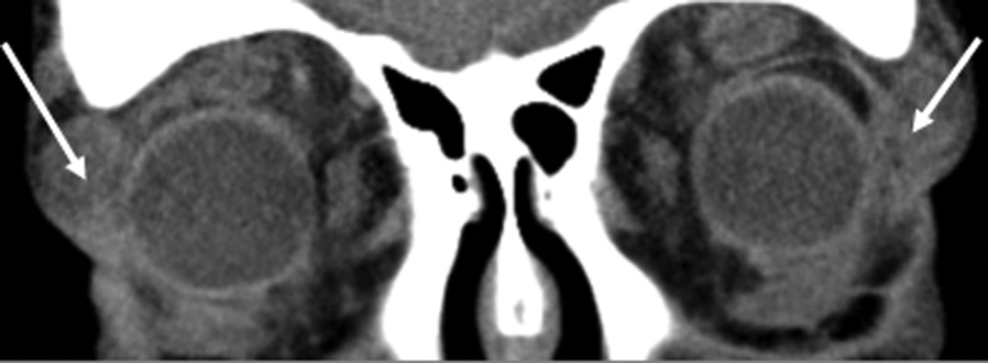 Рис. 7. МСКТ, корональная проекция: визуализируются увеличенные слезные железы (белые стрелки)