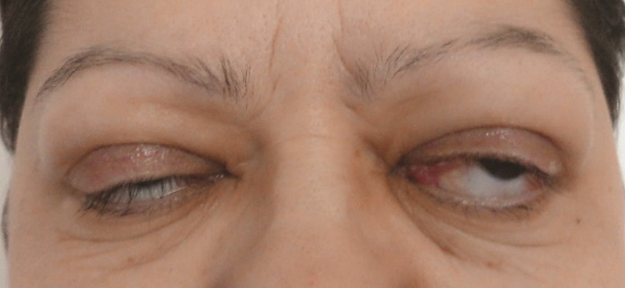 Рис. 5. Клинические проявления ЭОП с избирательным вовлечением ЭОМ. Выраженная асимметрия положения глазных яблок в орбитах. а — паралитическое косоглазие, преимущественно вертикального типа