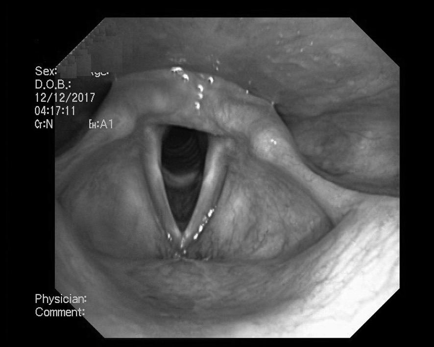 По данным видеоэндоскопического исследования от 12.12.17 перед началом курса голосовой реабилитации (рис. 1), слизистая гортани розовая, голосовая щель свободная, широкая, голосовые складки ровные, слизистая бледно-розовая, блестящая. Отмечается латеральное положение левой голосовой складки. Подскладочный отдел свободен (состояние гортани при дыхании).