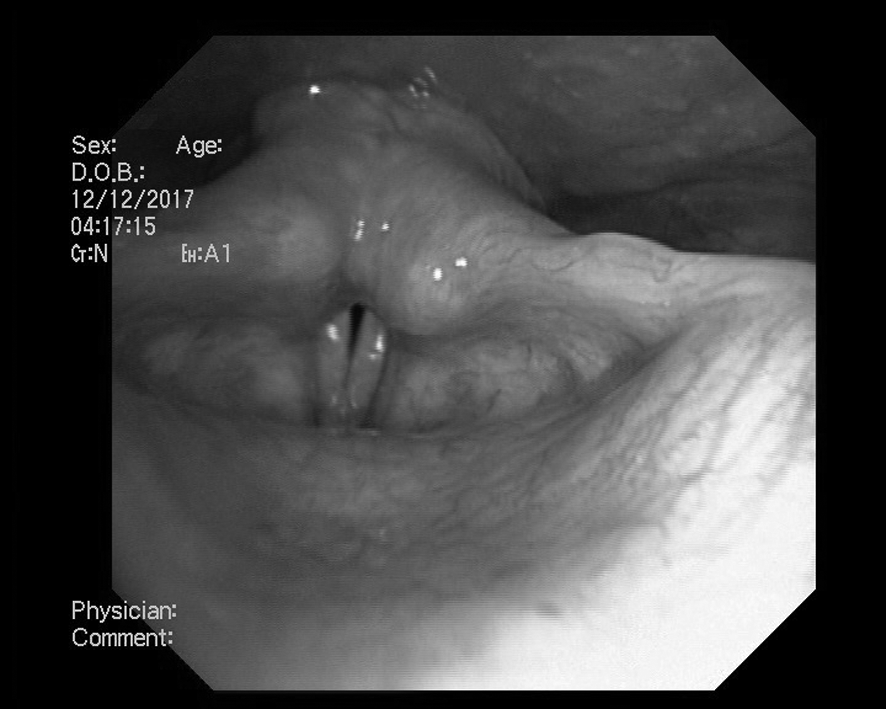 Эндоскопическое исследование проводилось натощак, после премедикации атропином 0,1%, на эндоскопическом видеокомплексе EVIS EXERA II фирмы OLYMPUS с помощью аппарата GIF Q-180 с возможностью воспроизведения изображений в HDTV качестве для детальной оценки уровня и степени поражения слизистой гортани и осмотром в режиме узкого спектра для оценки характера сосудистого рисунка слизистой оболочки гортани. При осмотре гортани выполнялся анализ состояния слизистой оболочки гортани и гортаноглотки, отмечалось наличие воспалительных изменений (гиперемия, отек, усиленный сосудистый рисунок) ларингеального эпителия, дополнительных образований доброкачественного характера и оценивалось состояние голосовых складок. Функциональная составляющая работы гортани оценивалась по положению голосовой щели и голосовых складок, учитывались одновременность, симметричность и равномерность смыкания каждого отдела голосовой складки при фонации и дыхании.