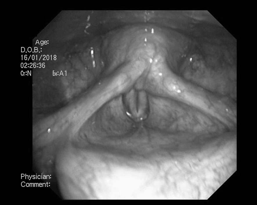 2. Рис. 2. Парез гортани слева. Положение голосовых складок при фонации. Латеральное положение левой голосовой складки. До начала лечения.