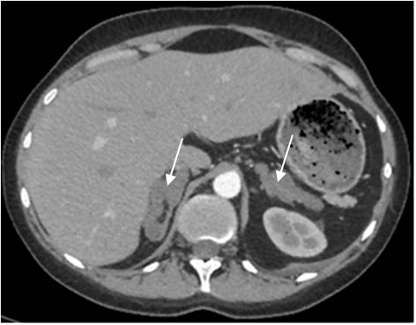 Рис. 1. МСКТ надпочечников пациентки Ю., артериальная фаза, аксиальная проекция (надпочечники указаны стрелками).