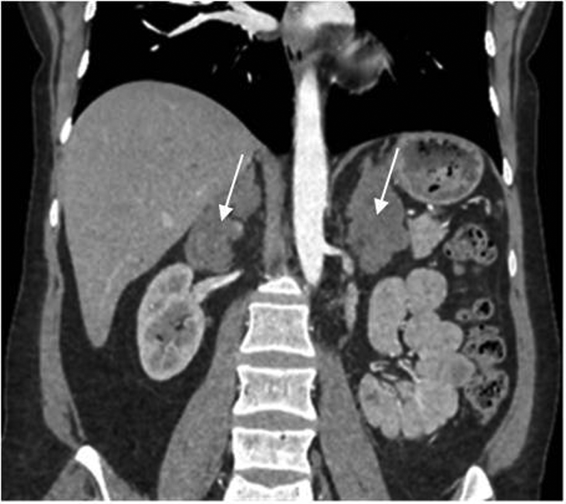 Рис. 2. МСКТ надпочечников пациентки Ю., артериальная фаза, коронарная проекция (надпочечники указаны стрелками).
