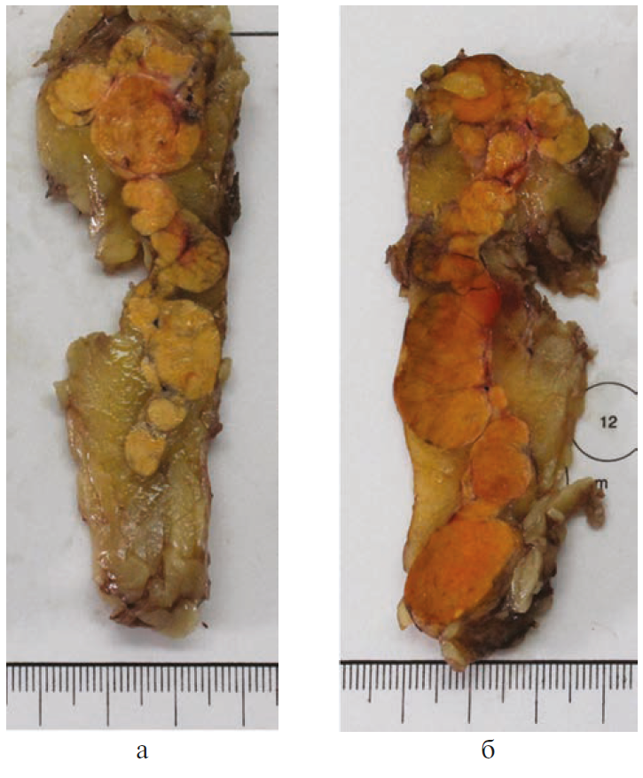 Рис. 3. Двусторонняя макронодулярная гиперплазия надпочечников, макропрепарат. В увеличенных надпочечниках определяются крупные узлы желтого цвета. а – правый надпочечник; б – левый надпочечник.