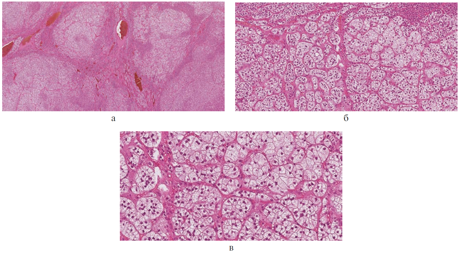 Рис. 4. Двусторонняя макронодулярная гиперплазия надпочечников, микропрепарат (окраска гематоксилином и эозином, увеличение ×50, ×100, ×200). а – некоторые узлы инкапсулированы и имеют соединительнотканные трабекулы; б, в – узлы построены из крупных светлых клеток, сливающиеся в тяжи и скопления.