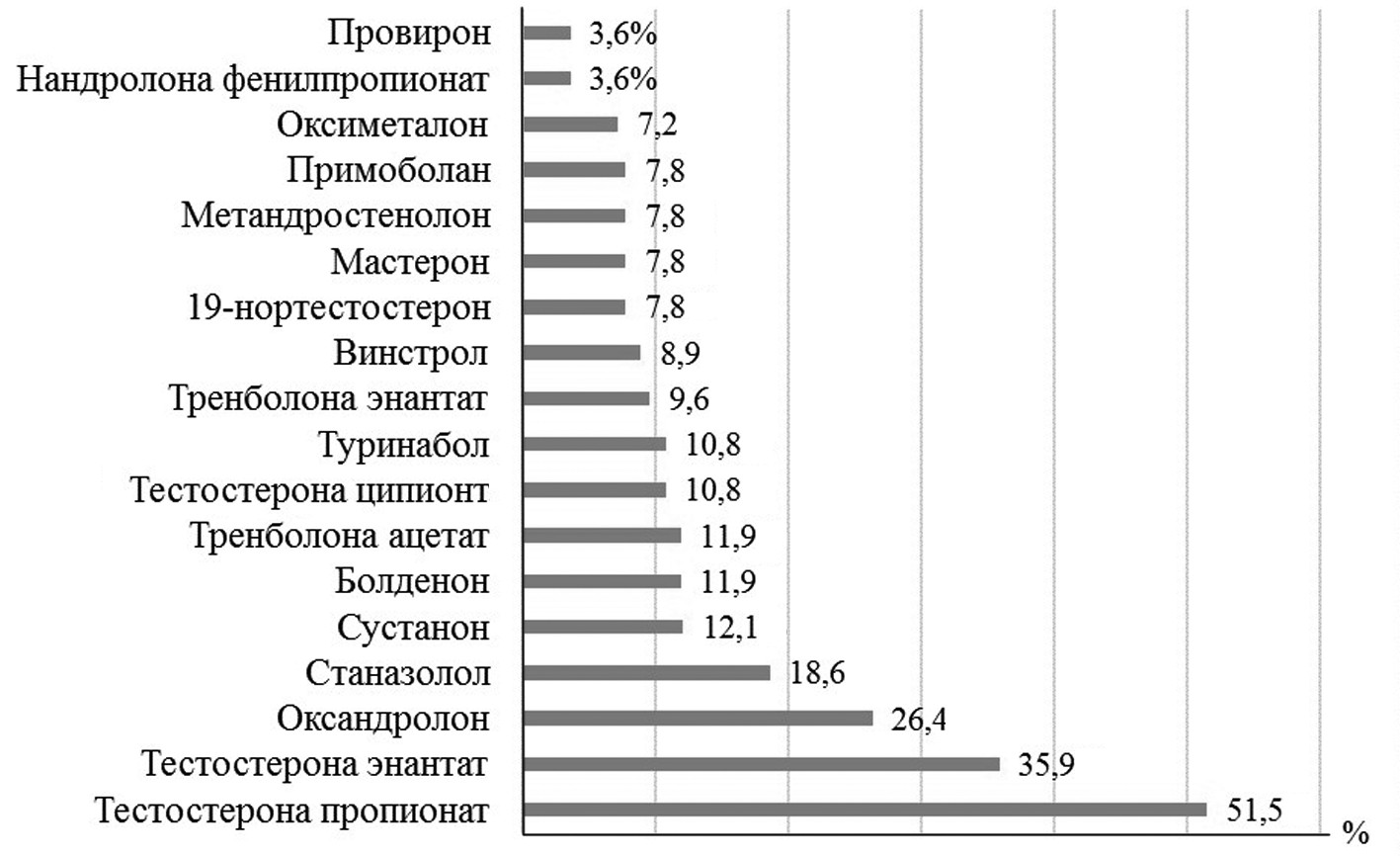 Results. Out of 1,815 sent questionnaires, we received back 762 ones. The criteria were met by 550 questionnaires. The mean age was 29.3±7.4 years. The use of AASs was reported by 30.4% of respondents. The main AAS (74.3%) consumers were males aged 22 to 35 years. The most popular drug was Testosterone Propionate (51.5%); the drug was often combined with Oxandrolone (19.7%). In 70.6% of cases, drugs were administered by injection or injection combined with tablet intake. The injectable testosterone dose ranged from 500 to 2,000 mg/week and above. The most common dose was 1,000 mg/week (23.9%). AAS administration for more than 1 year was reported in 16.1% of males. Anastrozole (55%), hCG (51.3%), Clomiphene (41.3%), and Tamoxifen (30.5%) were used during the recovery period. The main source of information on AASs, doses, and dosage patterns was the Internet (48.7%). A negative attitude towards AASs was found in 17.3% of respondents. The desire to receive qualified information about AASs and their impact on health was reported by 54.8% of the surveyed respondents.