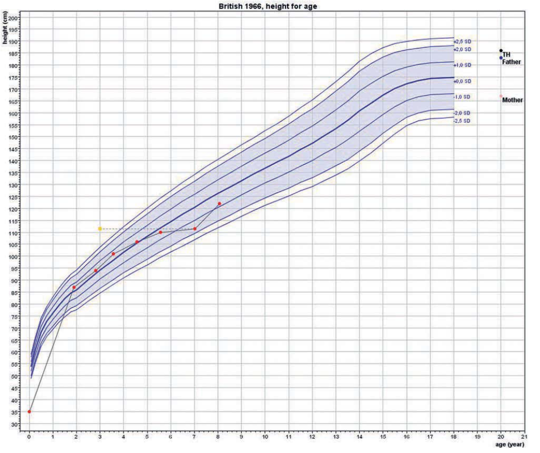 2. Рисунок 2. Мальчик, 7 лет 7 мес., Кохера-Дебре-Семильена на фоне 8 мес. терапии левотироксином
