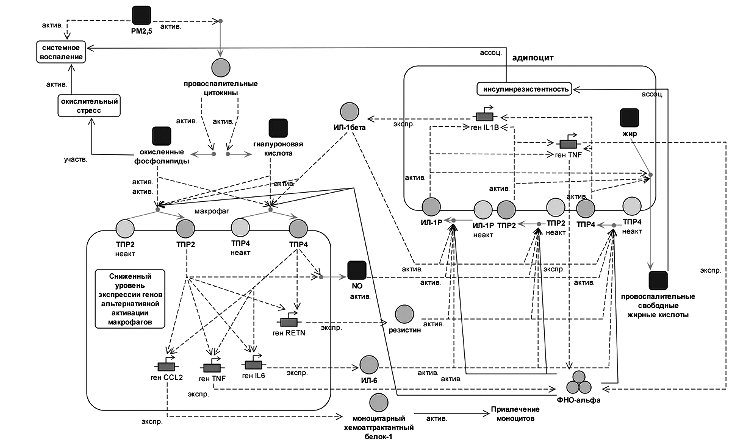 На рисунке приведено формализованное описание влияния РМ2,5 на процессы, лежащие в основе патогенеза СД2, включающие активацию провоспалительного иммунного ответа, развитие ИР и системного воспаления в организме.